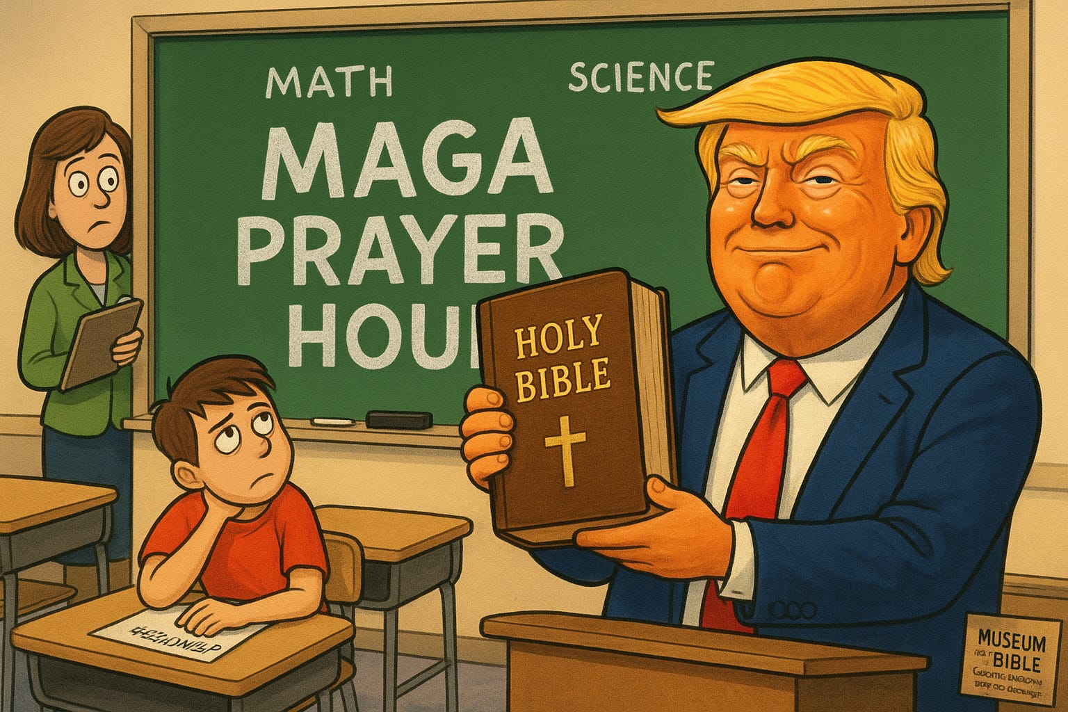 Now, kids already can pray in school. Nobody’s gonna get tackled by the lunch lady for whispering the Lord’s Prayer over a tater tot. What Trump wants is not liberty — it’s homeroom revival hour, with Uncle Sam holding the collection plate.