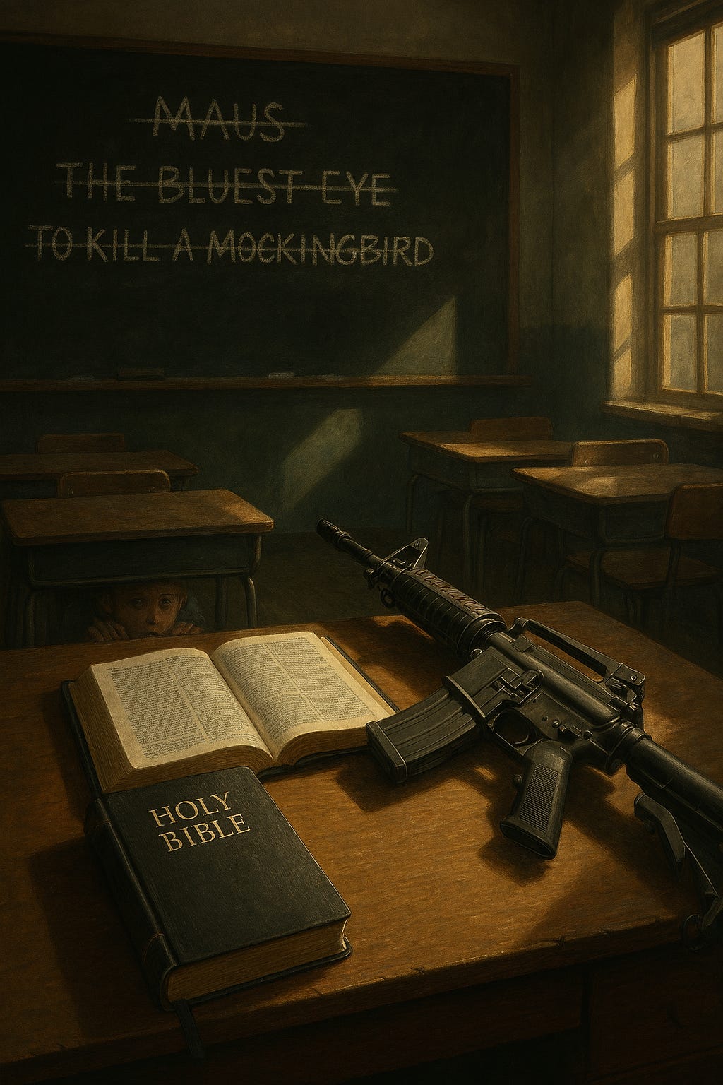 Think about the absurdity here: They’ll ban To Kill a Mockingbird because it talks about racism, but they’ll hand a math teacher a Glock and call it “school safety.” They’ll strip rainbow stickers off classroom walls, but shrug when kids practice hiding in closets during active shooter drills.