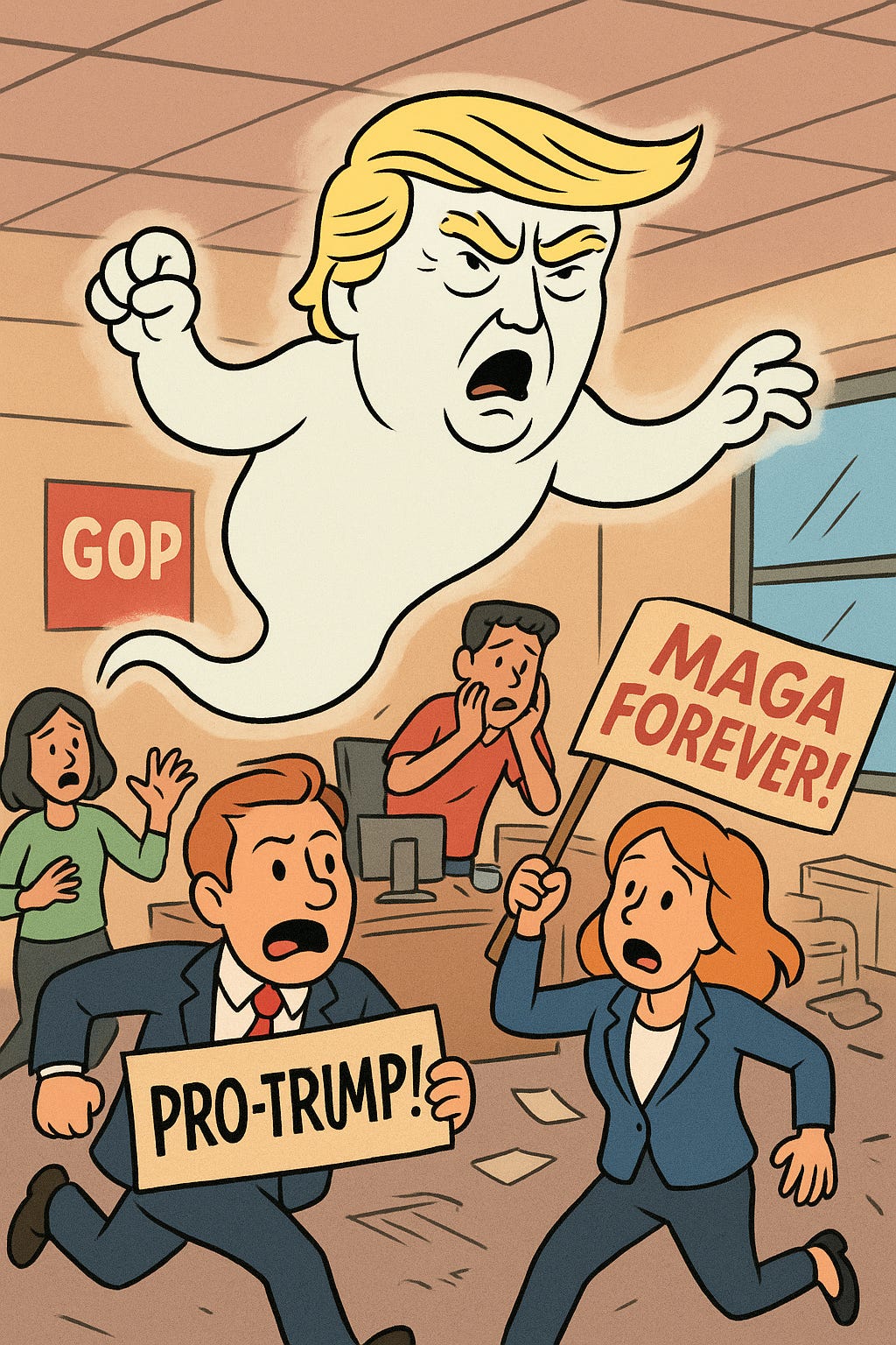 The GOP in 2025 is a haunted house. Trump is the ghost, and these candidates are screaming in corners trying to avoid the ectoplasmic wrath. Except the voters? They’re done with ghosts.
