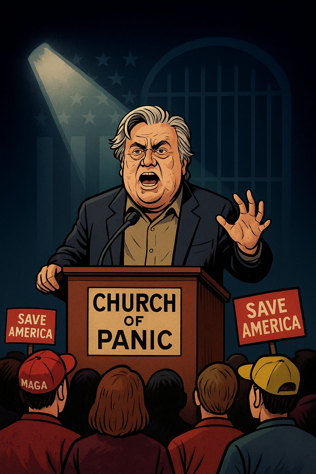 When Bannon says “we’ll go to prison,” he’s not just afraid; he’s monetizing the fear. As The Daily Beast{:target=”_blank”} reported, his “prison warning” was part prophecy, part political sermon — a way to weaponize accountability itself.