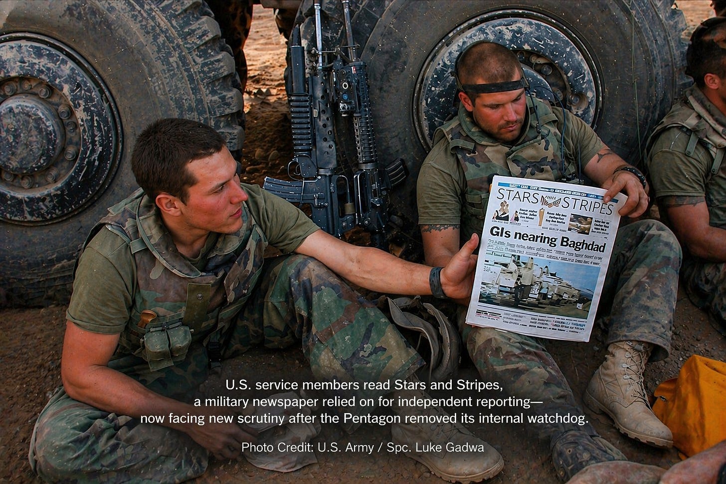 Stars and Stripes is the military’s own newspaper, funded by the Department of Defense and legally required to operate independently from it. The ombudsman’s job was to enforce that independence — to keep Pentagon hands off the editorial process. She was the last institutional check on the paper’s autonomy.
