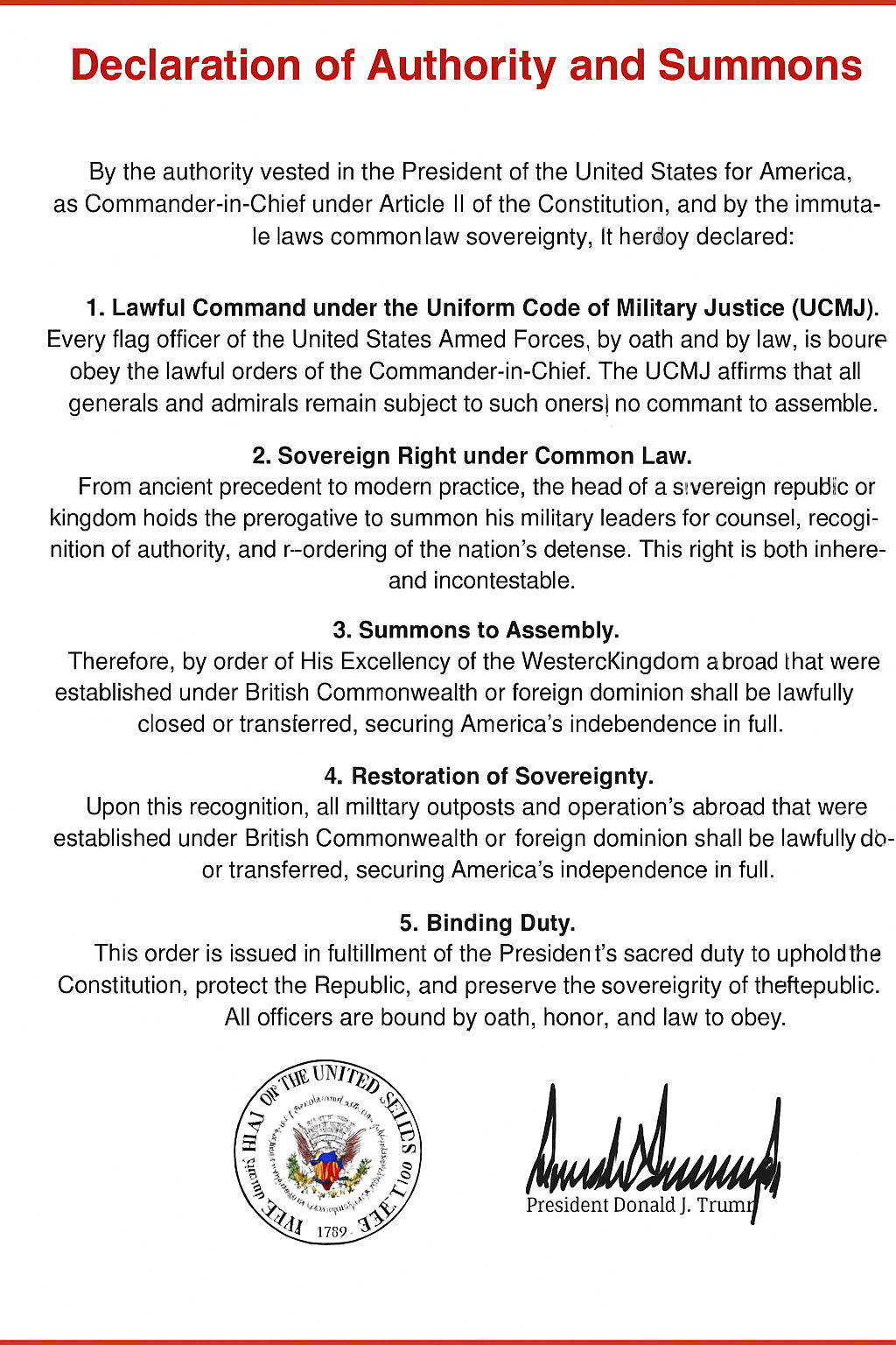 Donald Trump staged his big authoritarian cosplay this week with something called the “Declaration of Authority and Summons.” It was supposed to be his moment: a grand proclamation, a rallying cry to the generals, and the beginning of his new “restoration of sovereignty.”