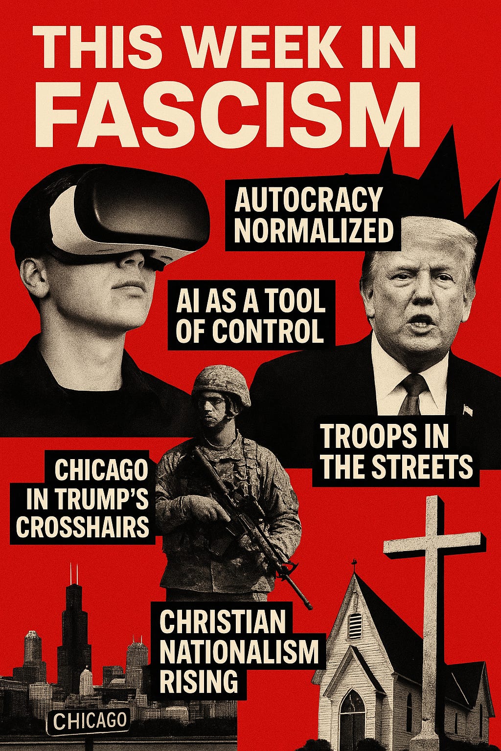 Put all of this together, and what do you see? Tech surveillance. Military intimidation. Autocracy normalized. Cities targeted. Religion weaponized. These aren’t five separate stories. They’re five fronts of the same battle. Fascism doesn’t land all at once — it builds itself step by step, until one day you look up and realize you’re already surrounded.