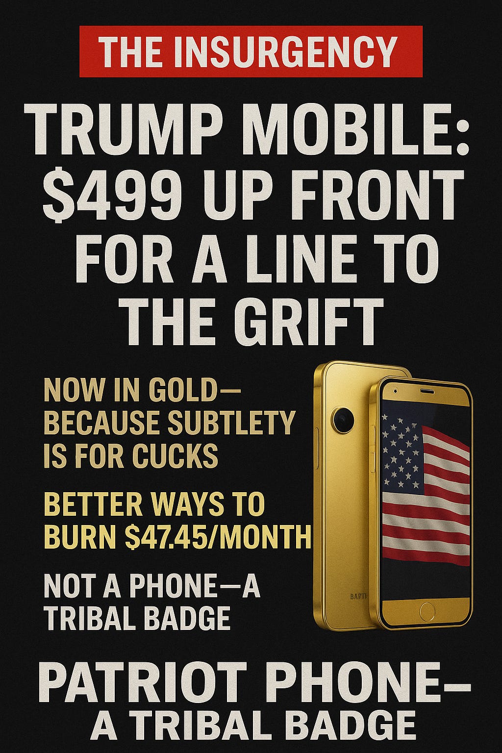 #TrumpPhone #GriftMobile #AuthoritarianWIFI #TheInsurgency #BurnTheEmpire #NoKings #FortySevenDollarsOfShame #PrepaidFascism #MakeCallsGreatAgain