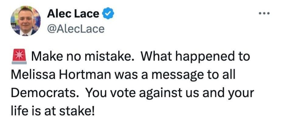 Alec Lace, a right-wing media cockroach with GOP ties, vomited out this straight-up terrorist threat after the Minnesota political assassinations: