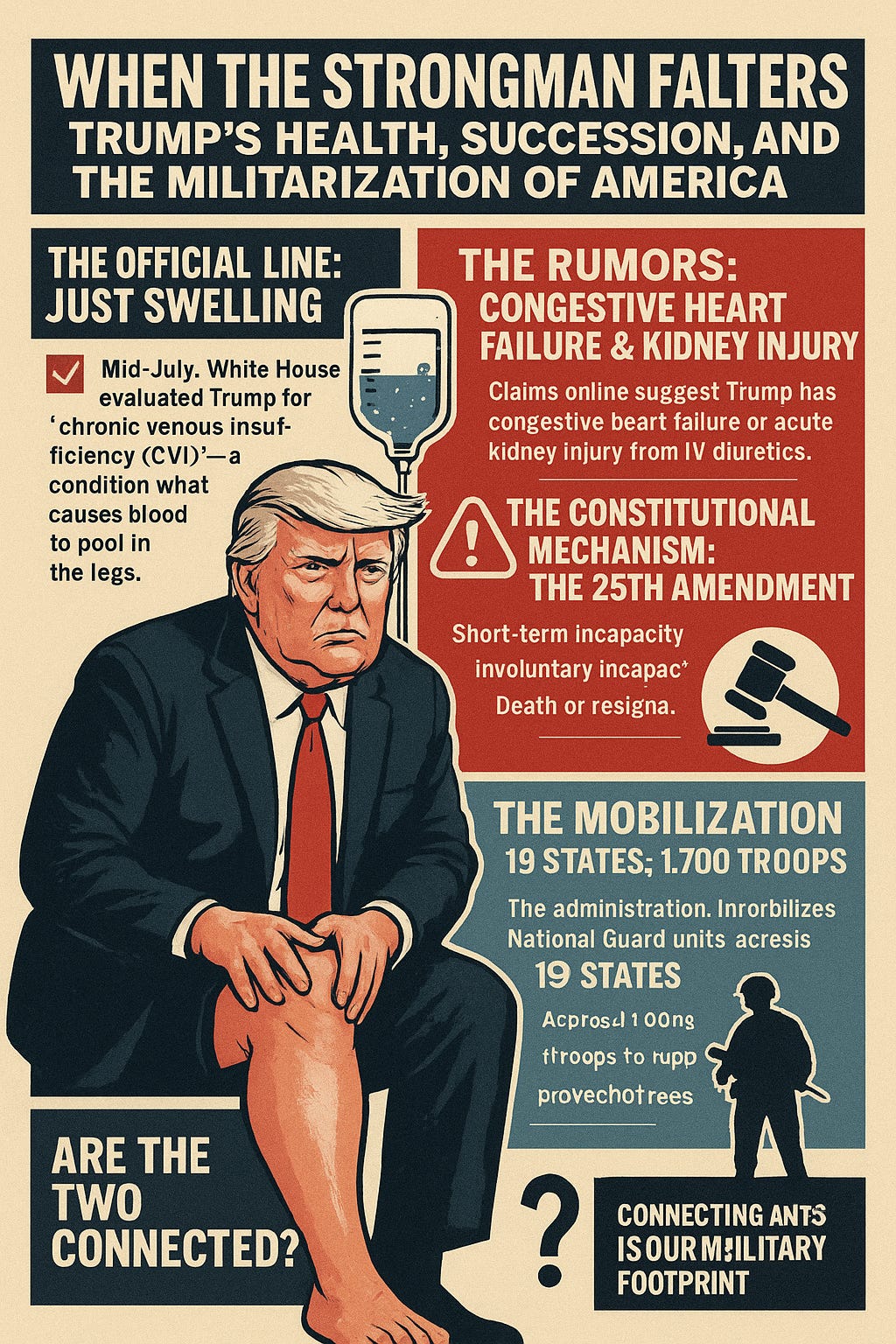 We can’t control whether Trump’s heart gives out. But we can control how we respond to the creeping authoritarianism that’s metastasizing under the cover of his health drama. Guard deployments in 19 states aren’t about protecting Americans; they’re about conditioning us to accept militarization as the new normal.